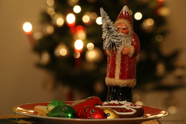 A Plate Filled with Christmas Chocolate and a Papier Mâché Nicholas
